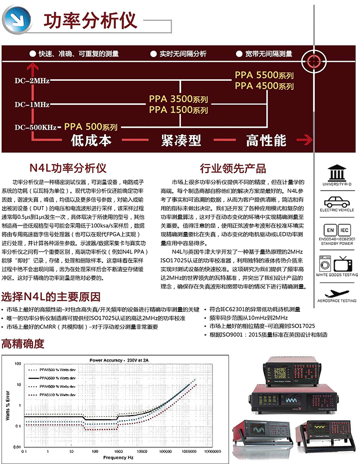 功率分析儀是一種精密測試儀器,可測量設(shè)備,電路或子系統(tǒng)的功耗(以瓦特為單位)?,F(xiàn)代功率分析儀還能確定功率因數(shù),諧波失真,峰值,均值以及更多信號參數(shù),對輸入或輸出被測設(shè)備(DUT )的電壓和電流波形進行采樣,該采樣過程通常每0.5us到1us發(fā)生一次,具體取決于所使用的型號,其他制造商一些低規(guī)格型號可能會采用低于100ksa/s采樣后,數(shù)據(jù)將由專用高速數(shù)字信號處理器(也可以在現(xiàn)代FPGA上實現(xiàn))進行處理,并計算各種派生參數(shù)。示波器/數(shù)據(jù)采集卡與真實功率分析儀之間有一個重要區(qū)別,高端功率析儀(例如N4L PPA)能夠“即時”記錄,存儲,處理和刪除樣本。這意味著在采樣過程中絕不會出現(xiàn)間隔,因為在處理采樣后會不斷清空存儲緩沖區(qū)。這對于精確的功率測量是絕對必要的。